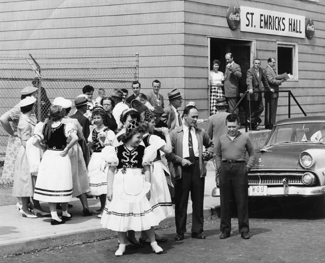Women are decked out in Hugarian dresses during a celebration at St. Emericks Hall in 1959. Photograph courtesy of Fran Kender.